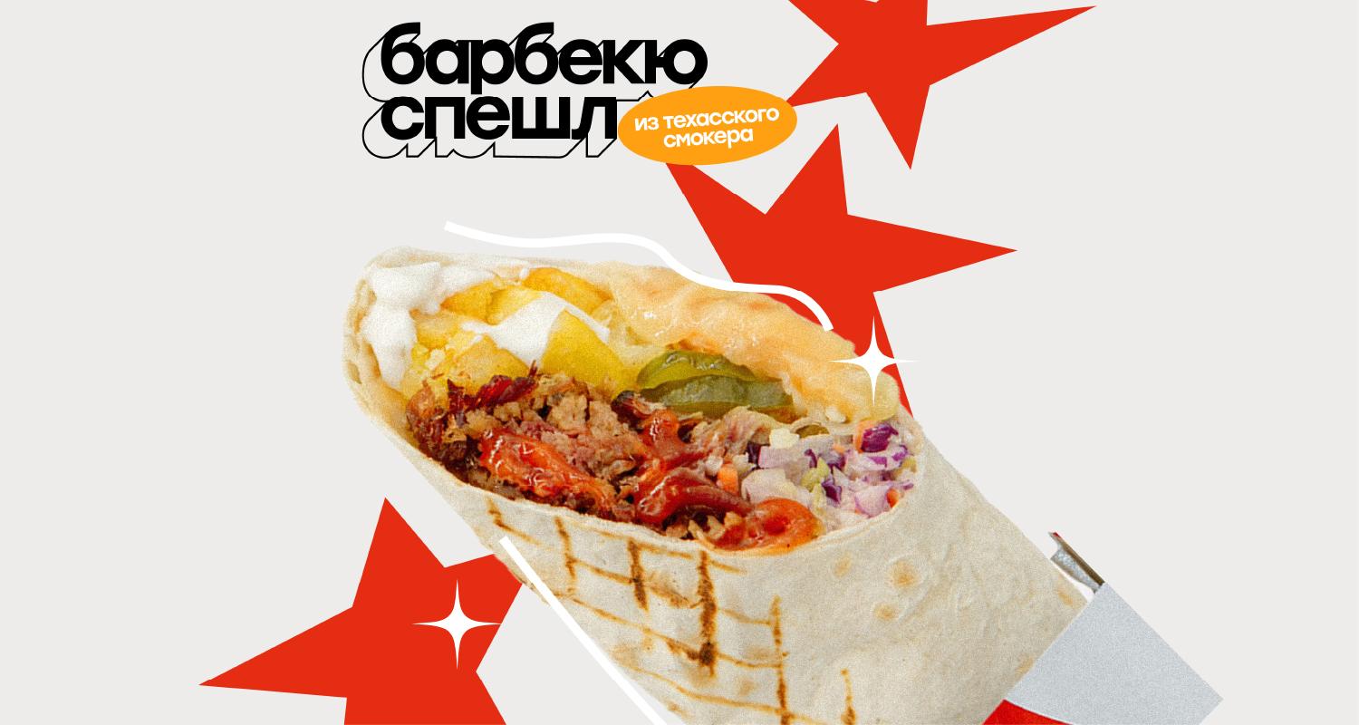 Рваная свинина из техасского смокера, свежие помидоры и огурцы, перчик халапеньо, красная капуста с огуречно-горчичным и сметанным соусами в пшеничном лаваше.