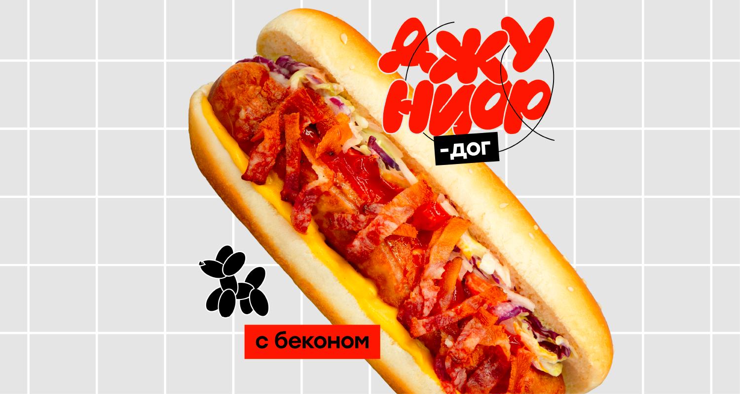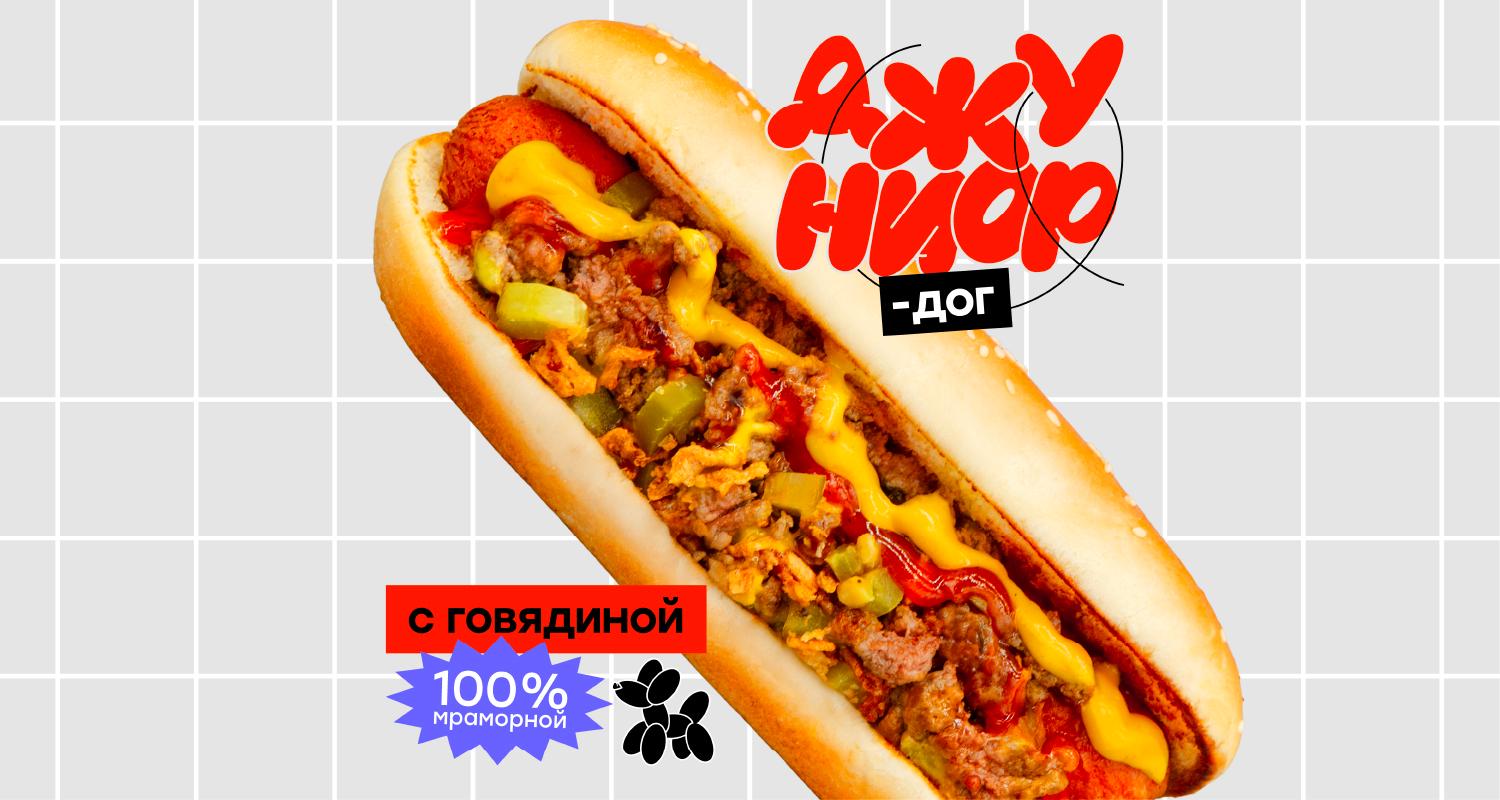 Куриная сосиска, фарш из 100% мраморной говядины, перчик халапеньо, маринованные огурцы с тремя соусами: томатным, горчичным и барбекю в пшеничной булочке с кунжутом.
