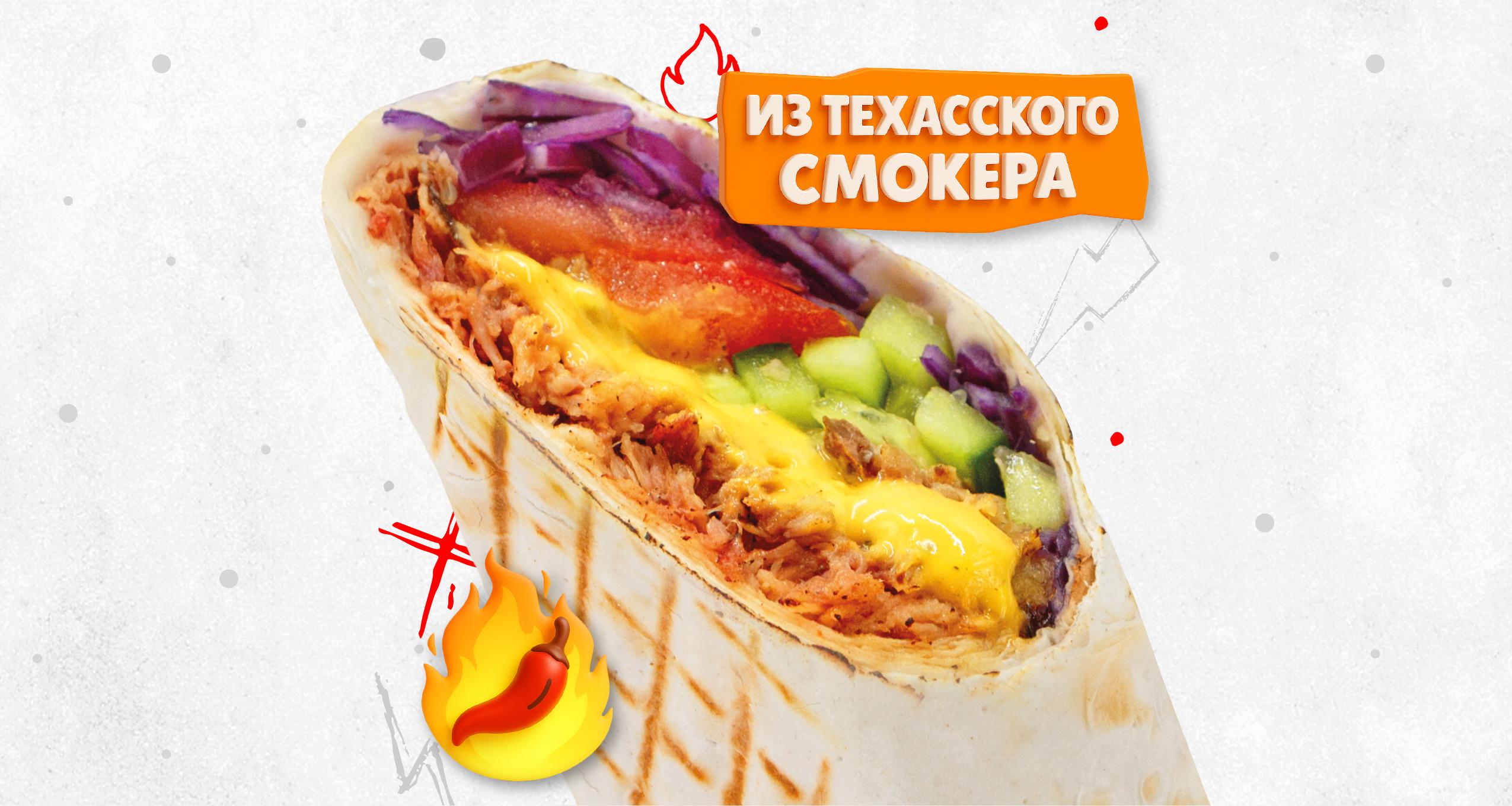 Рваная свинина, свежие помидоры и огурцы, перчик халапеньо, красная капуста с огуречно-горчичным и сметанным соусами в пшеничном лаваше.