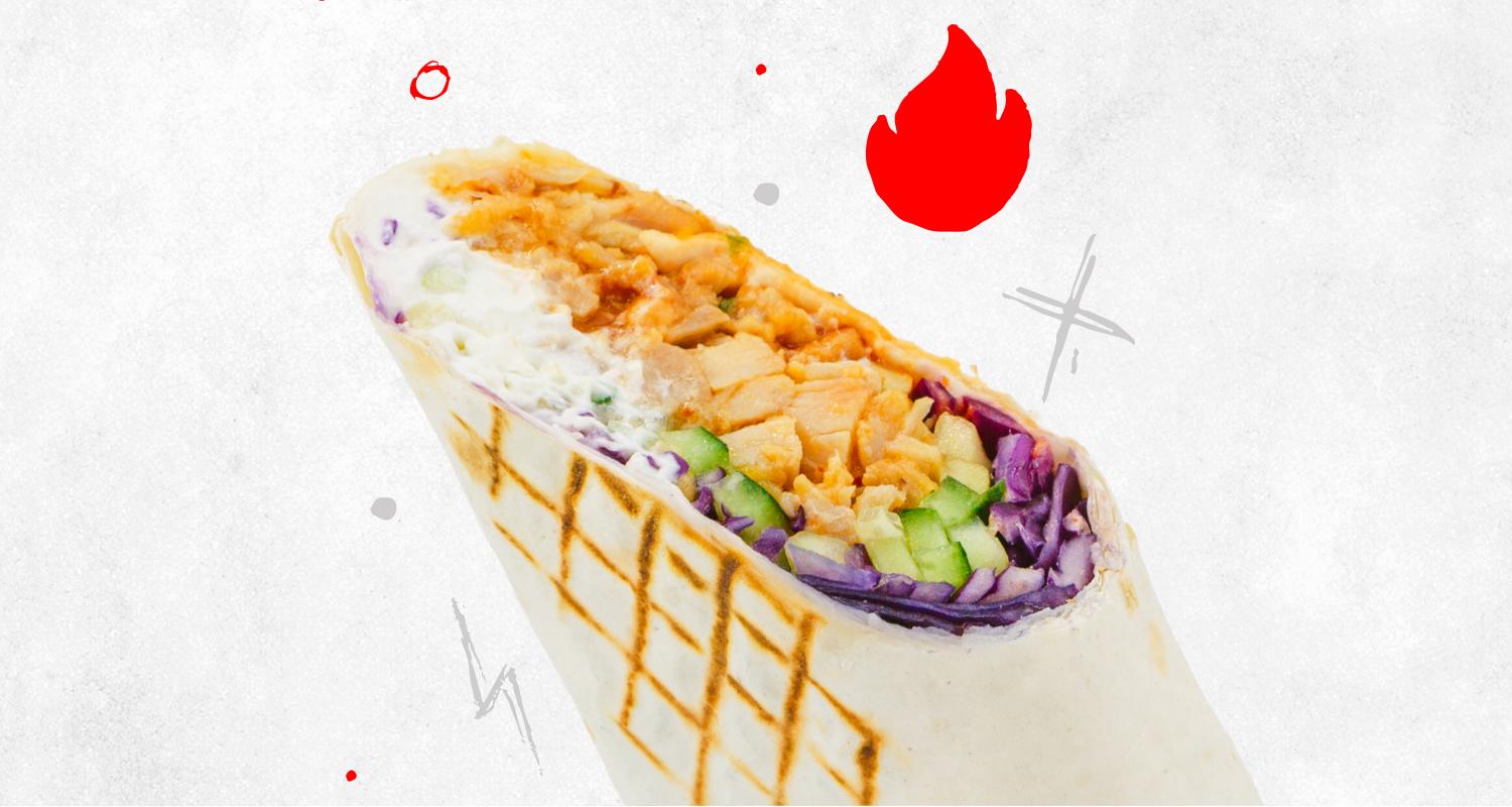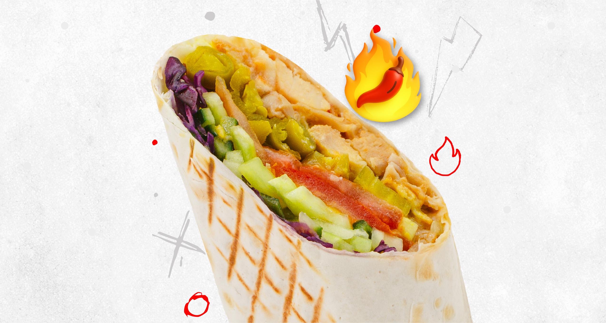 Сочное обжаренное мясо курицы (бедро), перчик халапеньо, свежие помидоры и огурцы, красная капуста с чесночным и горчичным соусами в пшеничном лаваше.