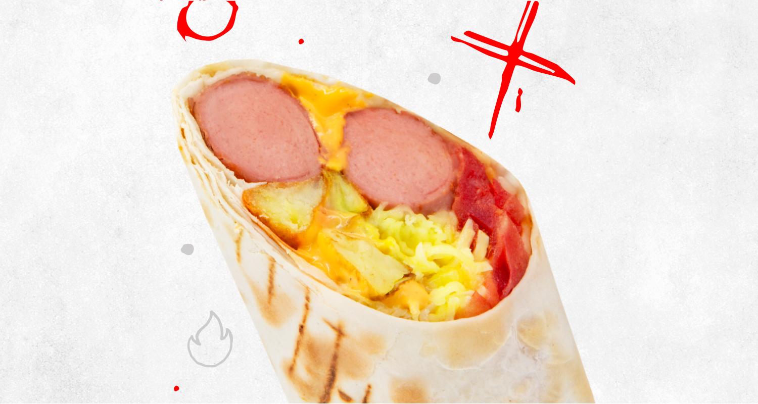 Куриные сосиски (2 шт.), картофельные дольки, сыр и свежие помидоры со сливочно-томатным и сметанным соусами в пшеничном лаваше.