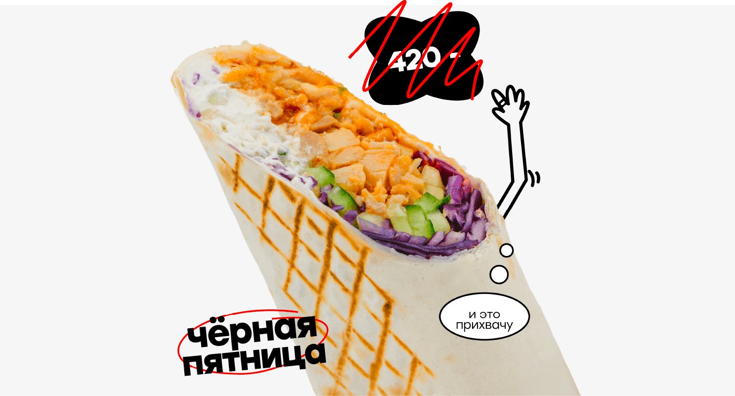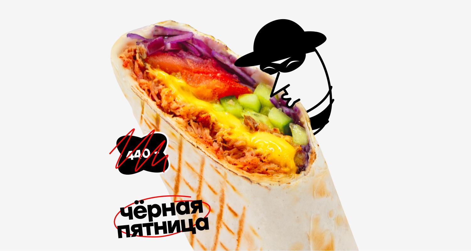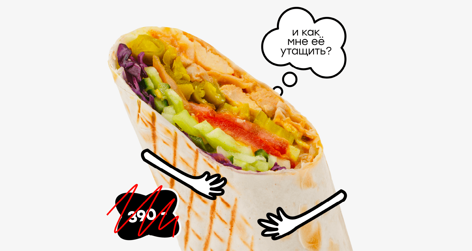 Жаренная на мангале свинина, картофельные дольки, помидоры, красный лук, маринованные огурцы с томатным и чесночным соусами в пшеничном лаваше.