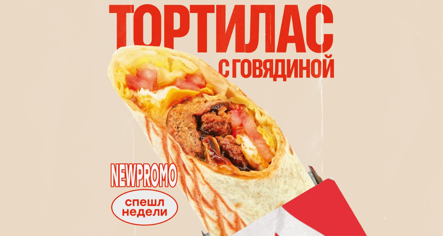 Говяжья котлета в тортилье с яйцом, маринованными огурцами, свежими помидорами, салатом айсберг, сыром и двумя соусами: сметанным и барбекю.
