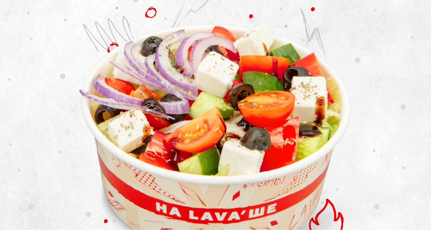 Сыр фета, маслины, помидоры черри, болгарский перец, красный лук, салат айсберг и свежие огурцы с оливковым маслом, бальзамическим кремом и орегано.